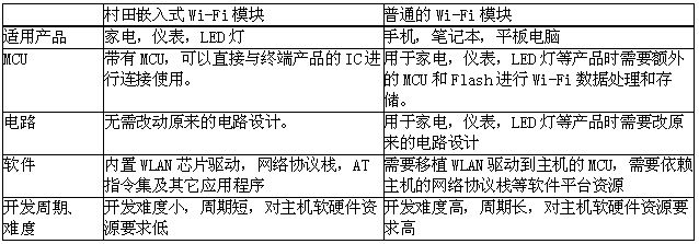 用于通訊產(chǎn)品的Wi-Fi模塊,因為終端產(chǎn)品,如手機(jī),筆記本具有強(qiáng)大的CPU和Flash進(jìn)行數(shù)據(jù)處理和存儲,因此在使用Wi-Fi時不需要額外的MCU。但是用于家電,儀表,LED燈等產(chǎn)品的Wi-Fi模塊,因為終端產(chǎn)品的MCU和Flash都無法支持Wi-Fi的功能,因此需要額外的MCU和Flash進(jìn)行數(shù)據(jù)處理和存儲。為在這些產(chǎn)品上的應(yīng)用提供方便,簡單的解決方案,村田開發(fā)了帶有MCU的Wi-Fi模塊-嵌入式Wi-Fi模塊。