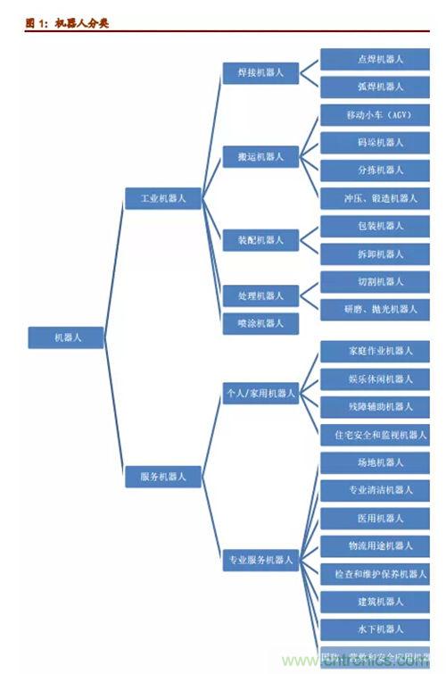 機器人專家從機器人應用環境出發,將機器人分為兩大類,即工業機器人和服務機器人。工業機器人根據用途不同,大致可以分為焊接機器人、搬運機器人、噴漆機器人、涂膠機器人、裝配機器人、碼垛機器人、切割機器人、自動牽引車(AGV)機器人、凈室機器人等。而服務機器人則是除工業機器人之外的、用于非制造業并服務于人類的各種先進機器人,主要包括個人/家用服務機器人和專業服務機器人。其中,個人/家用機器人主要包括:家庭作業機器人、娛樂休閑機器人、殘障輔助機器人、住宅安全和監視機器人等;專業服務機器人主要包括:場地機器人、專業清潔機器人、醫用機器人、物流用途機器人、檢查和維護保養機器人、建筑機器人、水下機器人,以及國防、營救和安全應用機器人等等。