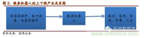 服務機器人行業生產所用的主要零部件為自動焊機、電子器件、微處理器、機器人用伺服電機、高精度減速器、機加件、氣動元器件、傳感器、電池、單板機等,歸屬于標準零部件、電子設備以及電子元器件等。服務機器人產業的下游則主要是醫療、家用、農用、軍事等行業和領域。