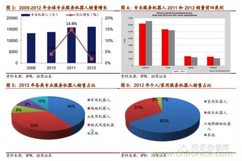 根據IFR2013年世界服務機器人統計報告,服務機器人2012年總銷量為301.6萬臺,總銷售額為46.2億美元。其中個人/家用服務機器人銷量為300萬臺,環比上升20%,總銷售額為12億美元;專業服務機器人2012年總銷量為16067臺,環比增長2%,銷售額為34.2億美元。