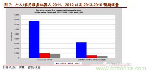 IFR報告預期,從2013年到2016年,全球工業機器人市場將以年均6%的速度增長,中國是這一增長趨勢的領跑者,年均增長率達15%。根據marketsandmarkets的報告,2011年全球服務機器人市場規模為183.9億美元,到2012年增長到207.3億美元,計2012-2017年全球服務機器人市場規模復合增速將達到17.4%,到2017年達到461.8億美元。對于專業服務機器,IFR預測2013-2016年估計有94800臺專業服務機器人會得到安裝使用,銷售額達171億美元。其中軍用機器人銷量約達28000臺;場地機器人中的擠奶機器人銷量估計為24500臺。兩者占總專業服務機器人銷量55%。