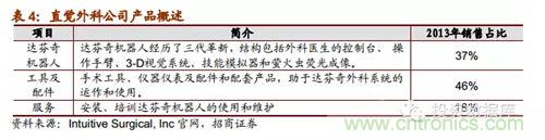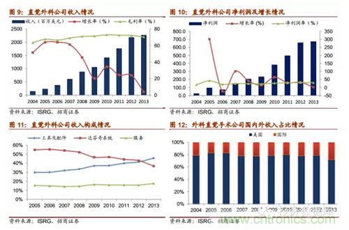 直覺外科公司是全球領先的微創機器人輔助手術機器人公司,2013年營收達22.65億美元,截止2014年第一季度達芬奇機器人累計銷售數量為3039臺,2014年8月總市值達159.60億美元。