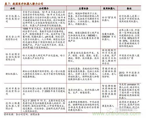 目前我國醫用機器人的普及率和使用率低下,截止直覺外科公司2014年第一季度的統計報告,我國只安裝了25臺達芬奇機器人,而臺灣、韓國及日本則已經安裝了20、44以及178臺達芬奇機器人。而根據世界銀行2014年1月公布的人口數據,大陸人口分別是臺灣、韓國及日本的58倍、27倍和10倍。雖然我國目前醫用機器人使用率和普及率低下,但這也反映出我國醫用機器人的市場潛力巨大。許多企業比如博實、新松機器人都在公司的產品規劃中加入了醫療機器人開發的戰略布局,而國際企業也針對我國市場擴大產能。比如2013年安川在中國常州新建工廠進行了產能擴張并計劃推出一款針對中國市場的康復機器人。