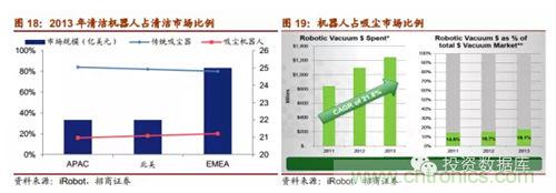 掃地機器市場具有巨大的潛力,增長勢頭強勁。13年家庭掃地機器人市場規模大于12億美元,過去三年復合增長率達21.8%。掃地機器人對傳統掃地設備的替代率不斷提高,13年占掃地設備市場18.1%。