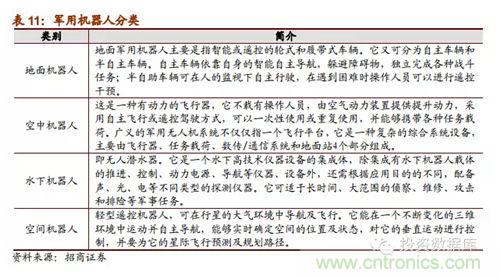 (五)軍事機器人是21世紀各國軍事安全重點戰略:蒂爾集團稱未來10年全球無人機研發投入和采購需求將達到940億美元。軍用機器人強國包括美德英法意以日韓,這些國家不僅在技術處于研究的先列,其產品已經在軍事上有了實際運用;我國與這些強國的技術差距明顯,受政策支持,軍事機器人相關企業發展前景明顯良好,可能成為企業未來強勁的收入保證。