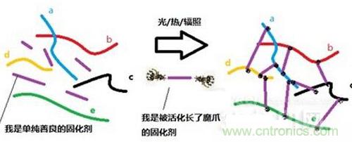 在圖中,小a、小b、小c等等是一群活潑的聚合物分子,因為這些鏈狀的分子之間很容易相互移動,所以看上去是一灘黏黏的液體(有時候可能粘度很大,比如硫化前的天然橡膠,它從樹上滴下來的速度非常緩慢)。有一天惡魔把一把單純善良的固化劑混進了小兄弟里面,小兄弟活潑依舊,絲毫沒有發(fā)現危險的存在。突然有一天惡魔把這灘小兄弟連固化劑一起放進了高溫高壓的一個東西里面(一般稱為硫化機/熱壓機),然后看似無害的固化劑長出了魔爪,死死抓住了小兄弟們,一個又一個的魔爪分別抓住不同的兄弟們,產生了很多交聯結構,即使沒有了高溫高壓也不會再放開。最后小兄弟們再也不能隨便活動了,這灘液體也變成了硬硬的一塊——這就是固化過程的通(dou)俗(bi)解釋。當然也有些固化劑的固化原理是引發(fā)小分子聚合物上的基團相互反應的,這種一般被稱為引發(fā)劑。