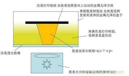 簡單來說,立體光固化的過程就是光照射光敏樹脂表面,使其固化成薄薄的一層固體,已經固化完成的部分被一塊基板黏附著,逐漸與光照射面拉開一定距離(通常是每次移動十幾個微米),然后在上一層固化樹脂的基礎上再進行下一層的照射和固化。經過層層固化疊加之后,最終就形成一個完整的立體結構。下面這張圖表示的就是SLA設備的基本結構,固化反應發(fā)生在打印樹脂與透光玻璃板的交界面上,由于光照射面在液面的下方,打印的過程看上去就像從液體里“拉”出了打印制件一樣。