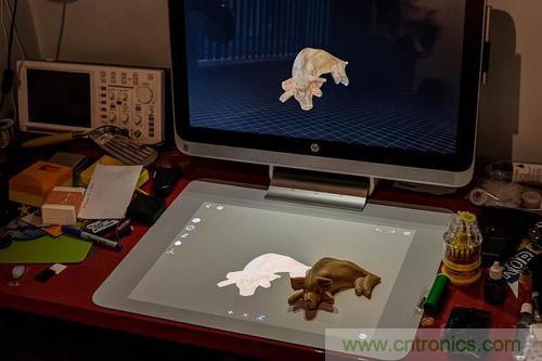 屏幕支架上方的是包含掃描儀相機(jī)的投影儀,允許在 Touch Mat 上盡可能直觀的使用。盡管 Touch Mit 本身并非觸控屏幕,但通過這些設(shè)備的交互能夠投影圖片并進(jìn)行相應(yīng)的觸控交互。Sprout Pro 正面裝備了支持 3D 眼鏡的 23.6 英寸 Zvr顯示器,同時(shí)支持虛擬現(xiàn)實(shí)和增強(qiáng)現(xiàn)實(shí)。