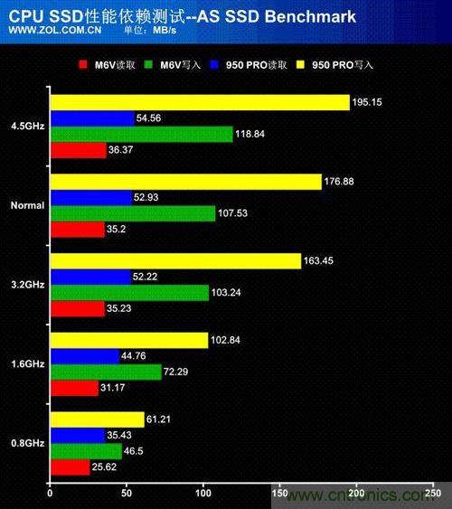 首先進行的SSD讀取測試,CPU 1.6GHz頻率下,平均讀取速度為4.82MB/s,頻率提升至4.5GHz后平均讀取速率提升至13.6MB/s,性能提升幅度高達182%,相對應(yīng)的CPU頻率之間的差異為181%,基本一致。