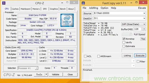 最后我們再來看看CPU頻率對SSD讀寫4KB小文件的速率影響,測試僅以四核1.6GHz和4.5GHz兩種配置成績對比,并開啟CPU超線程技術(shù)。為避免性能瓶頸,測試以浦科特M6V SATA 6Gbps SSD作為基準,與三星M.2 SSD 950 PRO互相拷貝4KB小文件,使用Fastcopy記錄讀寫時間和讀寫速率。(測試文件包包含20000個4KB TXT文檔)