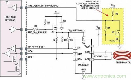 在設備原理圖中利用該電路(圖4)的各種變型,OEM產品可與任何NFC/RFID讀卡器或發起方系統進行通信。一旦電路板進入HF場,VOUT升高并導通Q2。開漏信號SYS_ALERT_INT#變為低電平,中斷或喚醒主機微控制器,由此表示系統處于HF場中。然后主機微控制器將RFID_VCC_ANABLE驅動為邏輯高狀態,將MOSFET Q1導通。此時,主機微控制器即可與產生HF場的NFC/RFID讀卡器交換數據。同樣,MAX66242的VCC引腳不需要連接電源,因為IC的內部電路由從HF場收集的能量供電。然而,VCC引腳如圖4所示連接,所以主機微控制器能夠在沒有HF場的情況下訪問IC。就像有線至無線轉換器一樣,I?C信號將數據傳輸至外部。數據流由RF-AIP (RF-Access-In-Progress)引腳控制,也與RF-BUSY引腳多路復用。