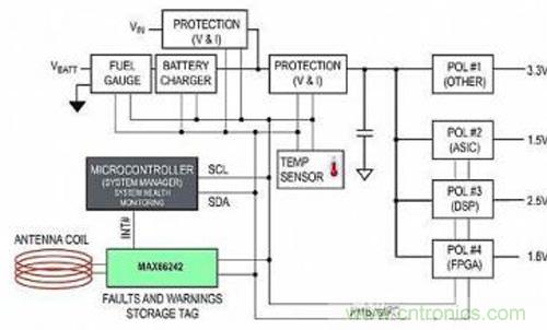 設計者可利用MAX66242儲存對系統運行至關重要的診斷和故障數據。在系統“死機”后或未上電時,可上傳該數據。這種系統健康和故障數據的收集是通過NFC/RFID標簽的接口實現的。圖7所示為典型的電源管理系統,其中每個負載點(POL)穩壓器由公共電源管理總線(PMBus)進行配置和監測。PMBus僅僅是I?C總線的一種變體。系統正常工作期間,持續監測每個POL的關鍵工作參數。在持續監測模式下,系統管理器也可執行修正措施,以響應故障或工作報警。