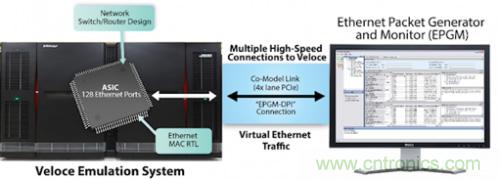 擁有成百上千個端口的設計需要與硬件擁有非常多的連接,而這些連接全都需要接線纜,這就使得在 ICE 環境中驗證網絡交換機和路由器設計不再可行。此外,一個128 端口的以太網設計等可能具有數億甚至數十億個門的尺寸。
