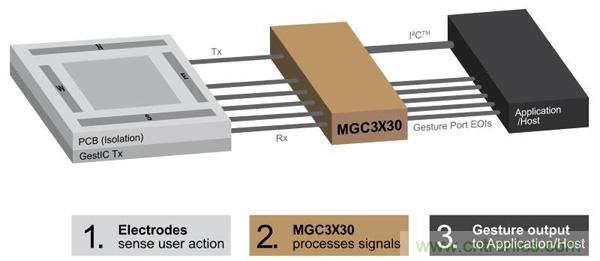 其中比較有代表性的,要數Microchip公司的GestIC技術。它基于電場感應的原理,在電子設備周邊的空間中形成一個電場。當手部在空間中運動時會使電場發生畸變,布設在電場中的電極接收器會感應到這種變化,并通過專門的控制芯片進行信號處理,對手勢進行識別和運動追蹤,并將數據傳遞給電子設備做出響應。Microchip代理商世健公司產品經理介紹,與采用攝像頭的光學3D手勢識別技術相比,GestIC技術最大的優勢在于功耗極低,能耗節省多達90%,同時能避免環境光等外部因素的干擾,雖然是一個近場識別技術,但其在家庭自動化、家電控制、音響系統、電腦及配件、汽車電子等方面,會有諸多應用場景。