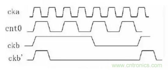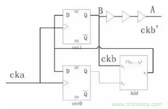 為了方便討論,時鐘樹插入以后,假設A與B之間有1個ckaCycle的skew;從圖3可以看到如果采用A點作加法器的輸入時產生的波形是ckb’,采用B點作為輸入時的波形是ckb,顯然,從例1的代碼來看,ckb才是正確的。因此必須注意到,如果時鐘當作普通的信號使用時可能帶來的問題,這類問題并沒有一個通用的解決辦法。在這個例子中,不采用時鐘樹上的信號才是正確的,但是在另外一些應用中,就必須采用時鐘樹上的信號。比如,時鐘是CK的兩個觸發器中鎖存的數據再由CK的高電平和低電平選擇輸出,那么,這個時候就需要作為選擇信號的CK從時鐘樹上拉過來。因此,如果設計中用到了時鐘信號作為普通信號的情況,在后端設計時就必須特殊處理。