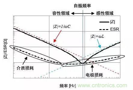 低頻率范圍:低頻率范圍的|Z|與理想電容器相同,都與頻率呈反比趨勢減少。ESR值也顯示出與電介質分極延遲產生的介質損耗相應的特性。