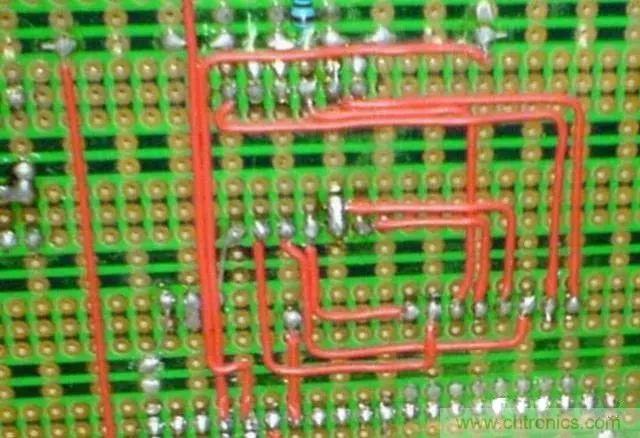 對(duì)于萬(wàn)能板的焊接方法,一般是利用前面提到的細(xì)導(dǎo)線進(jìn)行飛線連接,飛線連接沒(méi)有太大的技巧,但盡量做到水平和豎直走線,整潔清晰如下圖。