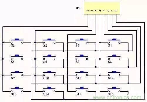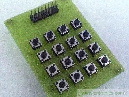 圖a是矩陣鍵盤電路,圖b是筆者焊接的矩陣鍵盤。這是一個(gè)利用了元器件自身結(jié)構(gòu)的典型例子:圖b中的輕觸式按鍵有4只腳,其中兩兩相通,我們便可以利用這一特點(diǎn)來(lái)簡(jiǎn)化連線,電氣相通的兩只腳充當(dāng)了跳線。讀者可以對(duì)照?qǐng)Dc好好體會(huì)一下。
