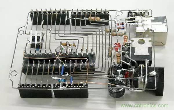 對(duì)于元器件在萬(wàn)能板上的布局,大多數(shù)人習(xí)慣“順藤摸瓜”,就是以芯片等關(guān)鍵器件為中心,其他元器件見(jiàn)縫插針的方法。這種方法是邊焊接邊規(guī)劃,無(wú)序中體現(xiàn)著有序,效率較高。但由于初學(xué)者缺乏經(jīng)驗(yàn),搭出來(lái)的板是這樣的……