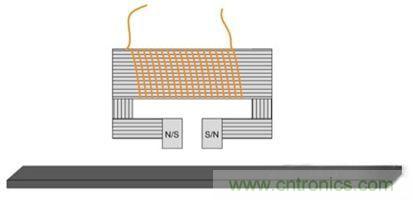 在實用化系統中需要用到一個寫入磁頭,它其實就是繞在磁心上的一個線圈。通過控制線圈中的電流方向可以很容易編程磁場方向。這有助于在磁卡上形成南北極圖案。磁極之間的空隙越窄,磁卡上能夠編程的數據密度就越高。
