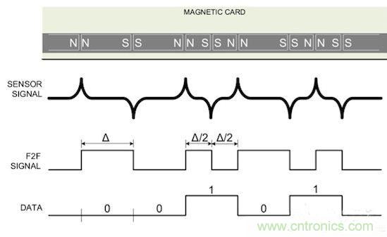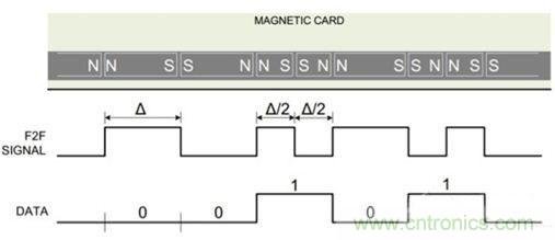 圖2:用電磁體磁化磁條表示邏輯1和邏輯0,其中用到了F2F編碼機制