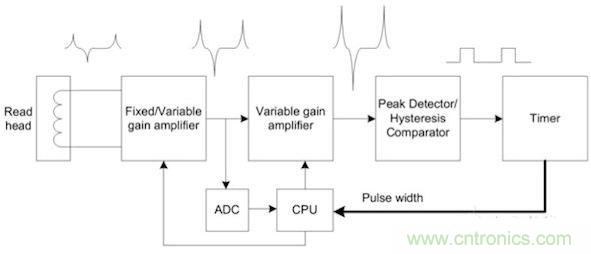 由于所有這些參數的影響,信號幅度可能在幾百個uV至幾十個mV之間變化。這個范圍可以用放大器進行補償。但不能用固定增益放大器。當劃卡速度很高,卡的質量又很好時,放大器輸出可以飽和到電源軌電壓。而當信號飽和時,用兩個連續峰值之間的時間差代表的信息將丟失。因此如實地放大傳感器信號、不至于使波形發生飽和或改變很重要。這就要求使用增益可配置的放大器,以便我們隨時調整增益。要做到這一點,系統必須能夠檢測信號變弱的時刻。這可以用跟蹤傳感器信號的ADC尋找近似的信號峰值來實現。