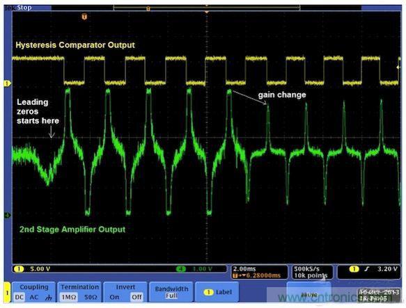 圖6顯示了一個完整的系統。最好將放大電路做成兩級,用ADC接收第一級電路的輸出。這樣就無需高分辨率ADC,8位ADC就足以滿足這種應用需求。第一級可以是固定增益的放大器,也可以是可變增益放大器。第二級是可變增益放大器。CPU讀取ADC結果,并通過調整增益使第二級放大器的信號輸出達到最佳。第二級放大器的輸出送到峰值檢測器/磁滯比較器電路進行峰值檢測。來自檢測器的脈沖輸出被饋送至定時器進行時間差測量,然后由CPU解碼出1和0。