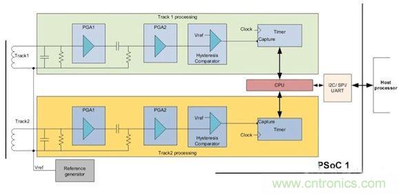 圖9顯示了基于賽普拉斯PSoC 1的雙磁道磁卡讀卡器實現方案。PSoC 1處理器具有與8位處理器內核集成在一起的可配置模擬和數字塊,在單顆芯片上集成了所有的功能。需要注意的是,圖中所示的無源器件是在處理器的外部。