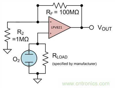 用氧氣傳感(見圖 3) 作為具體的應用實例,假設感應器的最大輸出電壓為10mV(通過制造商指定的負載電阻將電流轉換成電壓R_L) ,則運算放大器的滿量程輸出電壓為1V。通過Equation 2,可以看出 A_CL 的值需要為100,或者R_F是R_2的100倍。分別選擇100MΩ電阻和1MΩ電阻,得出增益值為101,且電阻值足夠大到可以限制電流并最小化功耗。