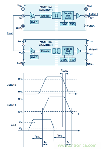 如圖5所示,傳播延遲偏斜被定義為器件間偏差。對(duì)于具有多個(gè)輸出通道的器件,此規(guī)格的表述方式相同,但被稱為通道間偏斜。傳播延遲偏斜通常不能在控制電路中予以補(bǔ)償。