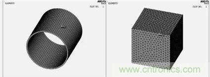 網格劃分對有限元的求解及其重要,單元越小,網格越細,則離散域的近似度越好,計算結果也越精確,但計算量及誤差都將增大。本文建立的線圈模型是一個規則的柱體,采用體掃掠方式劃分網格。空氣模型經過澆筑之后形狀變得復雜,采用自由方式劃分網格。圖2為線圈和空氣的有限元模型,最后通過numcmp命令將其澆筑在一起。