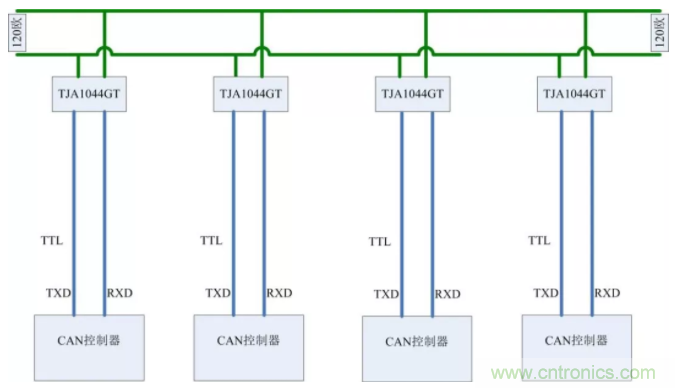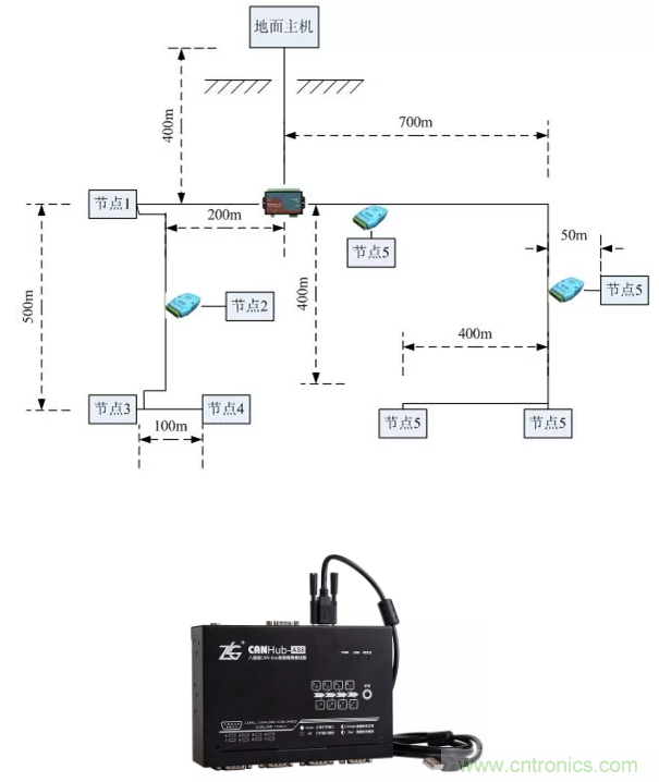 采用CANBridge中繼器,CANHub集線器等組網設備進行分支。這些設備每路都具備獨立的CAN控制器,所以可以將每段形成獨立的直線拓撲,方便施工。