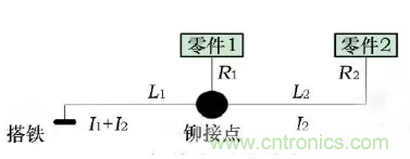 R1—零件1的電阻, L1—鉚接點到搭鐵點的導線電阻, R2—零件2的電阻,L2—零件2到鉚接點的導線電阻