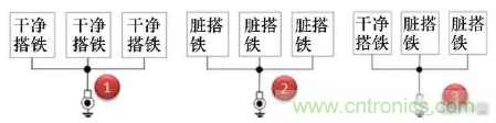 第1種方式干凈搭鐵回路之間的回路并接是允許的;第2種臟搭鐵回路之間的回路并接也是完全可以接受的;對于第3種臟搭鐵與干凈搭鐵回路并接,通常是可以接受的,但需要得到相關專業的評審通過。