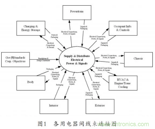 線束是汽車的神經網絡系統,在整車的運行中傳遞電壓、信號及大量的數據,圖1為各用電器線束連接示意圖。特別是在互聯網、大數據背景下,這就要求線束載體不僅僅起到通斷作用,對數據的傳輸速率及響應能力提出了更高的要求,同時由于線束的物理布置空間有限,對其失效性和售后返修帶來更大挑戰。