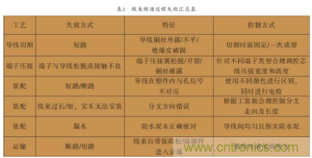 如下表1是線束在制造過程中最常見的失效方式,需在制造的各個環節保證線束的制造質 量。機械設備設定合理的規格參數,人工操作建立標準化操作及比對面板,最后對線束進行抽查全方位檢測而保證線束的制造質量。
