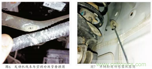 如下為兩種典型失效方式,圖6為發動機線束與空調補液管之間震動接觸造成的磨損,圖7為車輛輪速傳感器在運動到極限位置時悶頭受力后脫落。綜上需嚴格控制線束在運動包絡區域的布置,同時針對線束的磨損需遵循嚴格的評估標準。
