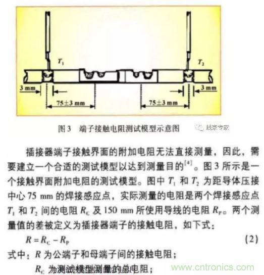 低電平接觸電阻測量法是使用微型歐姆表測試導線壓接和端子接觸區域的電阻。如圖3所示,使用微型歐姆表測量兩個焊接感應點T、T間的電阻和l50mm長度的所使用導線的電阻,據此可計算出所需要的接觸電阻。