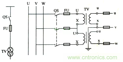 單相電壓互感器一次側端子為U、X,二次側為u、x;三相電壓互感器一次側端子為U、V、W,二次側為u、ⅴ、w、0。電壓互感器具有首端標志u的端子應和儀表的相線端連接,末端x接地并與儀表中性線端連接。