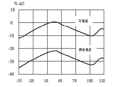 從圖中可以看到,COG電容器的容量幾乎隨溫度沒有變化,X7R電容器的容量在額定工作溫度范圍變化12%以下,Y5V電容器的容量在額定工作溫度范圍內變化70%以上。這些特性是必須注意的,否則會出現濾波器在高溫或低溫時性能變化而導致設備產生電磁兼容問題。