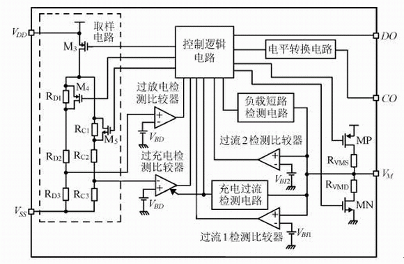 鋰離子電池保護芯片的基本功能是進行過充電保護、過放電保護和過電流保護,其中過電流保護包括充電過流保護和放電過流保護。下面以保護電路的基本功能為出發(fā)點,分析其系統(tǒng)的組成。