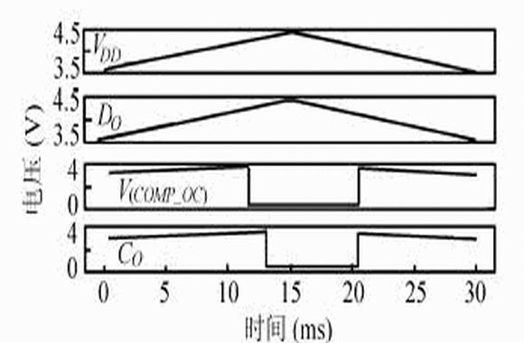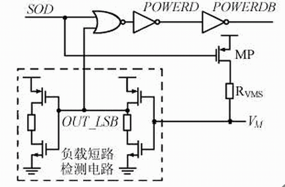 圖4 中SOD為過放電檢測信號,系統(tǒng)處于正常狀態(tài)時,SOD為高電平,VM為低電平,因此待機狀態(tài)控制信號POWERD輸出高電平、POWERDB輸出低電平。當系統(tǒng)進入過放電狀態(tài)時,SOD(延時后的信號)變?yōu)榈碗娖?,MP導通使VM變?yōu)楦唠娖?,最終使POWERD變?yōu)榈碗娖健OWERDB變?yōu)楦唠娖?,它們控制保護電路相應模塊停止工作,系統(tǒng)進入待機狀態(tài)。當對電池進行充電時,由圖1可知VM被強制拉到低電平,使負載短路檢測電路的輸出信號OUT_LSB變?yōu)楦唠娖剑淮藭r,不論SOD為何值或非門都將輸出低電平,POWERD由此變?yōu)楦唠娖?,這樣,就可實現(xiàn)待機狀態(tài)的退出。