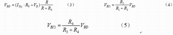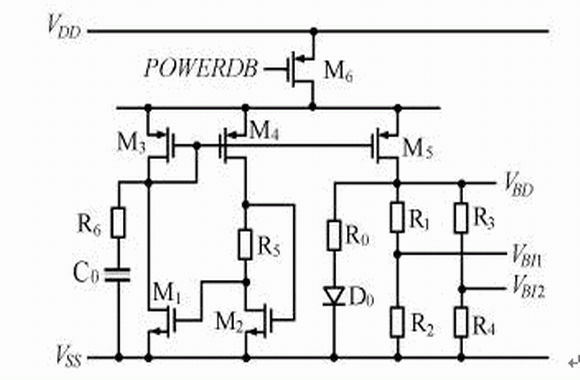 電路的工作原理為:由M1—M4和R5組成的自偏置電路產(chǎn)生具有正溫度系數(shù)的電流,它在電阻R0所產(chǎn)生的壓降和具有負溫度系數(shù)的PN 結(jié)壓降(D0上的壓降)相加,從而輸出零溫度系數(shù)的基準電壓VBD;為滿足同一電路中輸出不同的基準電壓源,利用電阻分壓將VBD 分成了VBI1及VBI2輸出;C0和R6組成啟動電路。