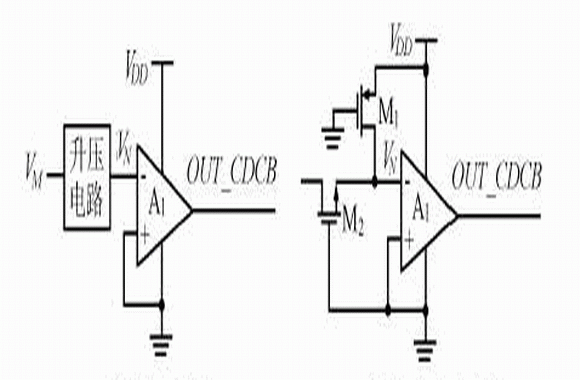充電過流的檢測歸結(jié)為檢測VM電壓,其臨界值為VCH(約為-1.3V)。如果所用工藝的MOS管閾值電壓可以調(diào)節(jié),負電壓檢測電路可用差分結(jié)構(gòu)的比較器實現(xiàn),其中比較器的一個輸入端接地,并且兩個差分對管的閾值電壓需要調(diào)整。為了使該電路能用常規(guī)的CMOS 工藝實現(xiàn),本文在過零比較器的基礎上引入升壓電路,如圖6(a)所示當VM》VCHA時,升壓電路使VN>0 。升壓部分具體實現(xiàn)如圖6(b)所示。