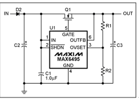 過壓保護(hù)(OVP)器件數(shù)據(jù)資料中提供的典型電路可以滿足大多數(shù)應(yīng)用的需求(圖1)。然而,有些應(yīng)用需要對(duì)基本電路進(jìn)行適當(dāng)修改。本文討論了兩種類似應(yīng)用:增大電路的最大輸入電壓,在過壓情況發(fā)生時(shí)利用輸出電容存儲(chǔ)能量。