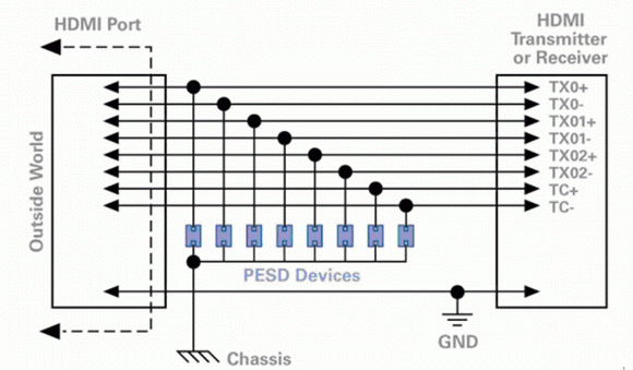 F2:帶PESD器件的典型HDMI電路示意圖(基于HDMI規(guī)范1.2)