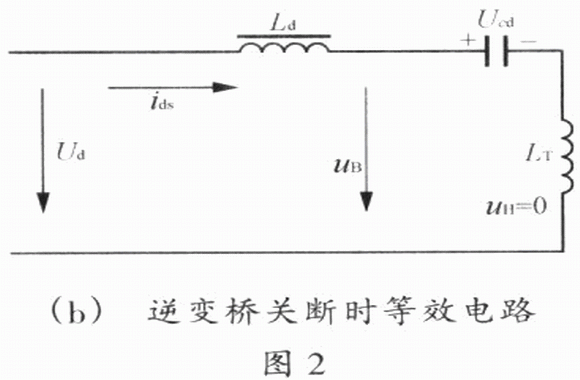 這一浪涌電流由檢測電路檢巾并使保護電路立即動作,發出過流信號,整流電路即由整流狀態向逆變電路過渡。逆變橋關斷時的等效電路如圖2(b)所示,短路電流ids移至Cd支路,Cd被充電,Cd端壓逐漸上升,短路電流下降,此后短路電流在Cd、Ld、以及吸收電路中R和C構成的回路中作振蕩衰減,直至能量消耗完為止。ids沿Ld流過,由于電路的慣性較大,電流增長不多,近似于短路前的工作電流Ido,于是浪涌電路的幅值為Ism=IHsm+Ido (4)