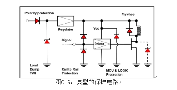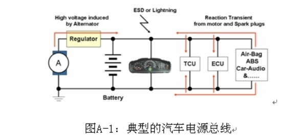 汽車電子,如電子控制單元、傳感器和娛樂系統(tǒng),都是連接在一根電力線上。這些電子產(chǎn)品的功率來源是電池和發(fā)電機(jī),兩者的輸出電壓都不穩(wěn)定,會受到溫度、操作狀態(tài)和其他條件的影響。此外,由于這些系統(tǒng)使用了螺線管負(fù)載,如燃料噴射、氣門、發(fā)動機(jī)、電氣和水解控制器,ESD、尖峰噪聲和各種瞬變及浪涌電壓都會進(jìn)入電源及汽車系統(tǒng)的信號線。