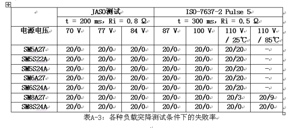 表A-3所示為Vishay的負(fù)載突降TVS在各種負(fù)載突降測試條件下的失敗率。SM8S24A是ISO-7637-2 Pulse 5測試最大額定值條件下最強(qiáng)大的器件。