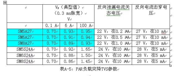 Vishay有兩種類型的汽車電子初級保護(hù)負(fù)載突降TVS:EPI PARTVS和Non-EPI PARTVS。PAR TVS的產(chǎn)品組列在表A-4當(dāng)中。